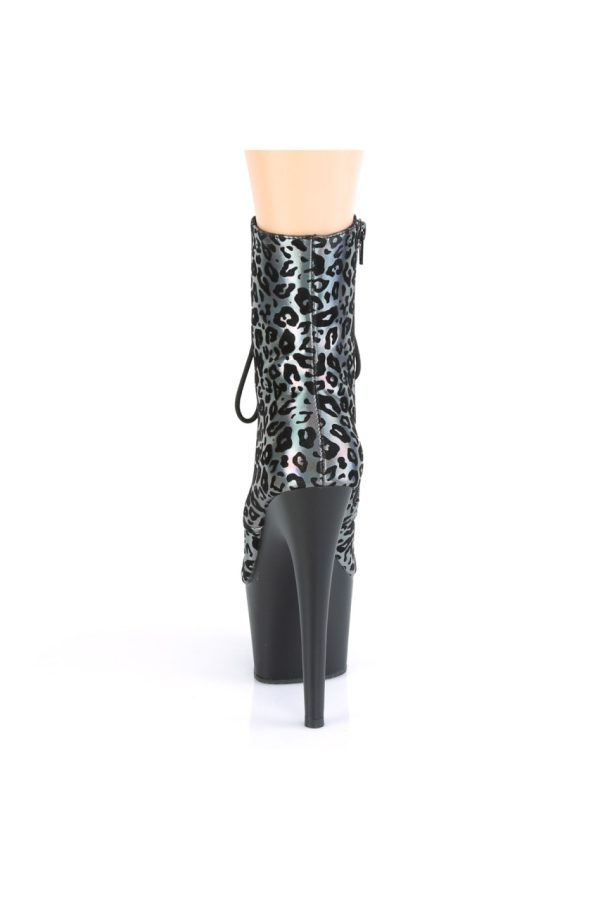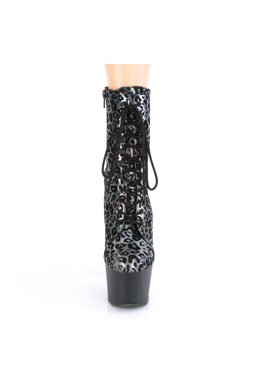 7″” (178mm) Heel, 2 3/4″” (70mm) Platform Lace-Up Front Ankle Boot w/Holographic Leopard Print Upper, Inner Side Zip Closure