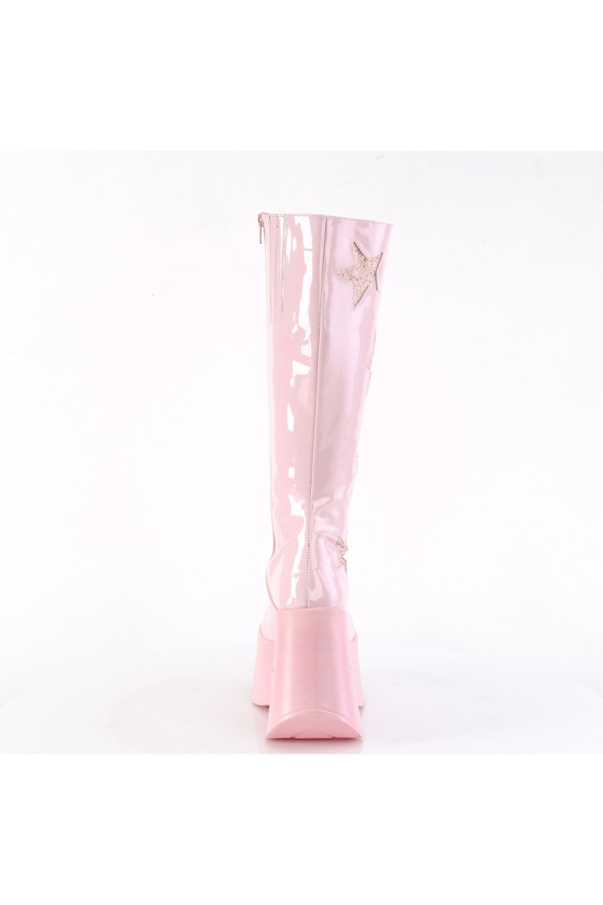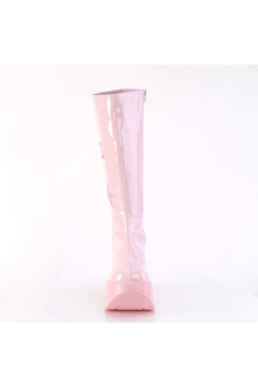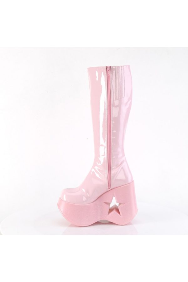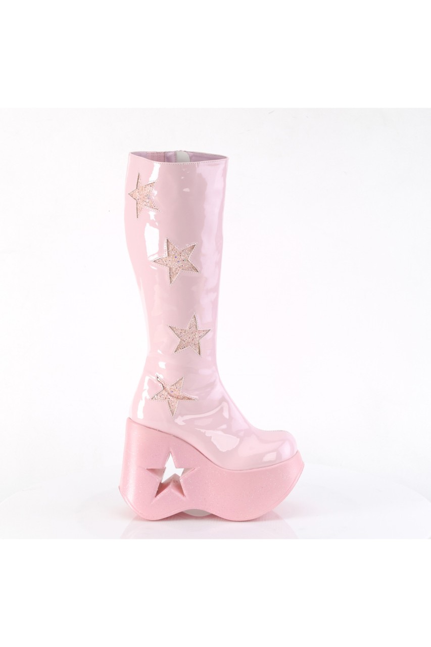 5″” (127mm) Star Cutout Platform Wedge Knee High Boot Featuring Glitter Star Side Patch Details, Inner Side Metal Zip Closure